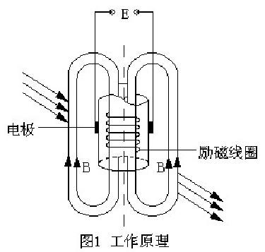 傳感器實際上是一種液體流速測量儀表。它是應(yīng)用法拉第感應(yīng)定律的原理制成的流速測量儀表。圖1 是插入型流量計基本工作原理的示意圖。用一個長桿將一個小的電磁流量傳感器插入到被測量管道中規(guī)定的位置,導(dǎo)電流體垂直流過傳感器的工作磁場時(轉(zhuǎn)換器向傳感器提供勵磁電流時,在勵磁線圈構(gòu)成的勵磁系統(tǒng)中便產(chǎn)生工作磁場),相當(dāng)于導(dǎo)體在磁場中作切割磁力線運動。根據(jù)法拉第感應(yīng)定律可知,在導(dǎo)體的兩端產(chǎn)生感應(yīng)電動勢。此感應(yīng)電動勢由接觸流體的一對電極來檢測。